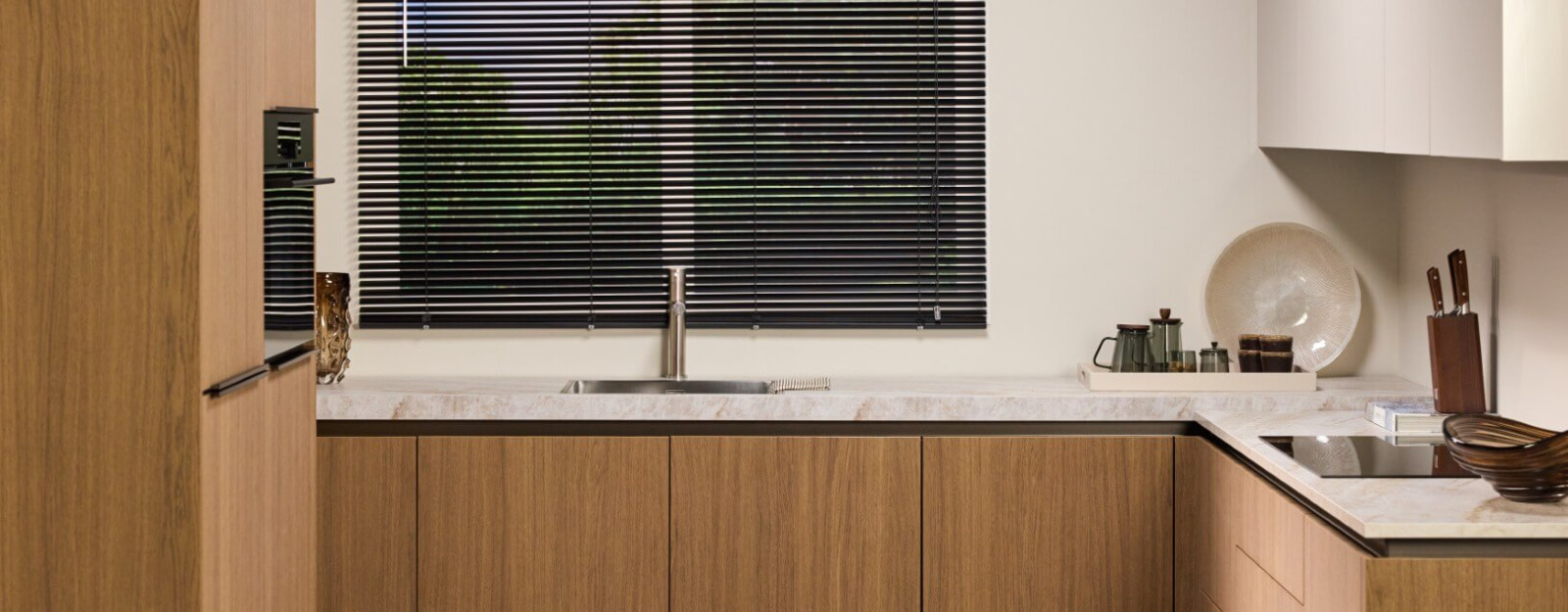 Het kunststof blad in de kleur Divine is onderhoudsvriendelijk en past mooi bij de warme kleuren van de keuken. De spoelbak is gecombineerd met een handige kraan met één hendel. Onder de bovenkasten zorgt ledverlichting voor goed licht tijdens het koken.
